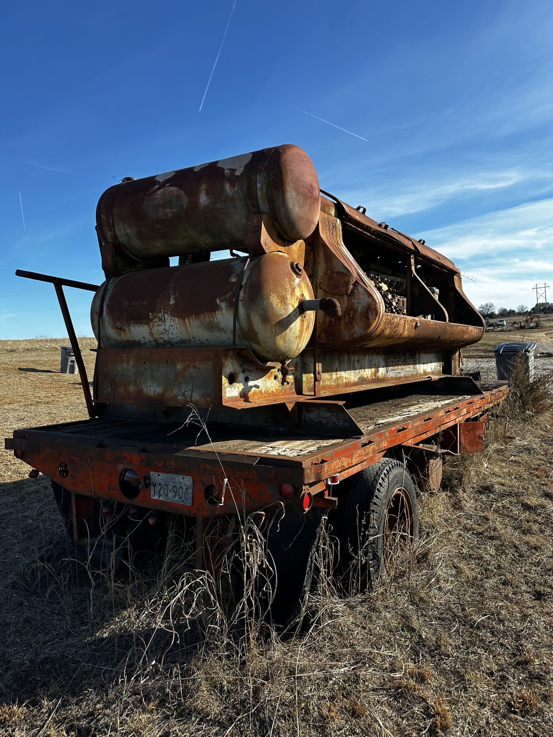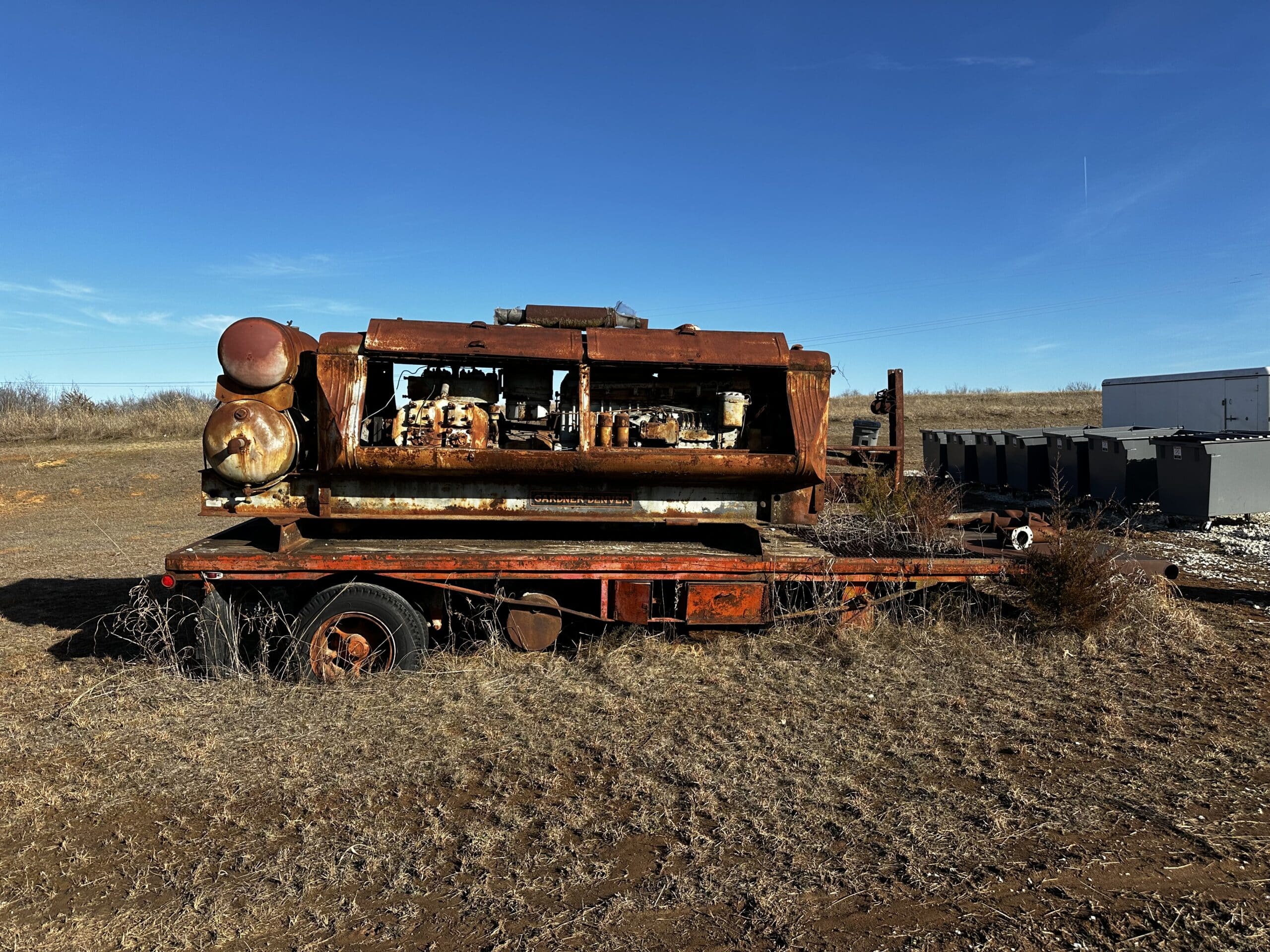 Trailer is 25′ long. No rolling tail board. Gardner-Denver air compressor sold separately.